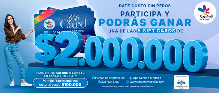 Registra en los puntos de información, en nuestra App Santafé Medellín o a través del WhatsApp 321 760 41 66, tus facturas de compra con fecha desde el primero (1) de febrero de 2026 al veintiocho (28) de febrero de 2025, por cada cien mil pesos (COP $100.000) en compras y participa en el sorteo de cinco (5) tarjetas bono regalo, cada una por dos millones de pesos ($2.000.000) para redimir únicamente en establecimientos del Centro Comercial Santafé Medellín P.H.